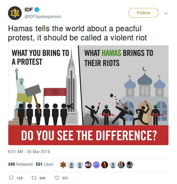 Ahead of the violence beginning on Friday morning, Palestinian HRDs reported widespread defamation campaigns against activists who organised local demonstrations, the shutting down of independent Palestinian media outlets, and HRDs' social media accounts being shut down by Facebook and Twitter. The military has led an extensive smear campaign aiming to paint the Great Return March as Hamas-led, when in fact it is a collaboration between civil society organisations, HRDs, independent activists, labourers, teachers, students, and families. Ahead of the march, HRDs reported fears that as a result of the smear campaign labeling it a violent Hamas event, Israel would react with even more lethal force and be met with international silence. The fears were well founded. Ahead of the protests, Israel deployed 100 additional special forces snipers and several infantry brigades to the border region. Military generals told Israel’s security cabinet in advance that there would be Palestinian casualities. Meanwhile, Israel's billion-dollar PR-machine went into overdrive, launching a series of infographics that predetermined the march to be violent and led by Hamas.