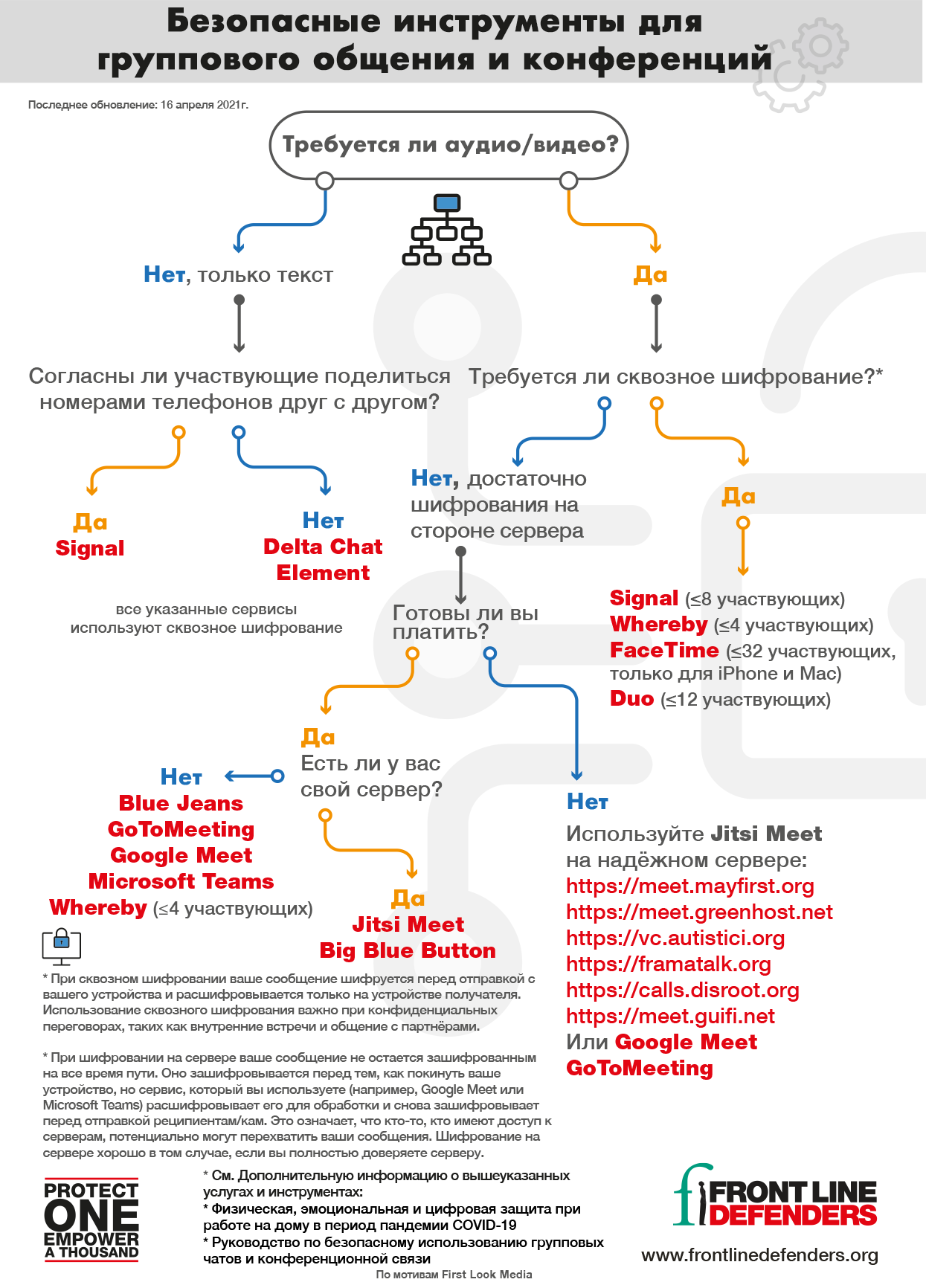 Почему мы не упоминаем Zoom и иные платформы/инструменты: Существует множество платформ, которые могут быть использованы для групповой коммуникации. В этом руководстве мы решили остановиться на тех, которые, по нашему мнению, наиболее удобны и безопасны. Конечно же, ни одна платформа не гарантируют 100% безопасность, поскольку любая передача данных сопряжена с риском. Мы не включили такие платформы, как Zoom, Skype, Telegram, WhatsApp и другие, поскольку считаем, что их использование несёт слишком высокие риски, и Front Line Defenders не может их рекомендовать.